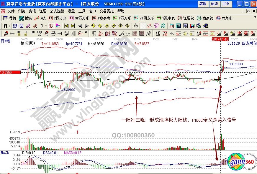 但是,仔细剖析该股在1月18日的走势改变,构成的是涨停大阳线的走势,不仅仅打破了极反通道生命线,并且打破了前期的三个阶段性高点,是一阳过三峰的走势,macd目标构成金叉买入信号,出资者此刻能够活跃布局买点方位。