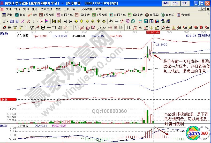 经过一段时间的拉升上涨,股价在1月24日呈现跌落的阴线,前一天的上影线日跌破蓝色上轨线是卖出的信号,并且macd红柱线逐步缩短是跌落的行情,出资的人能活跃考虑卖出的操作办法。